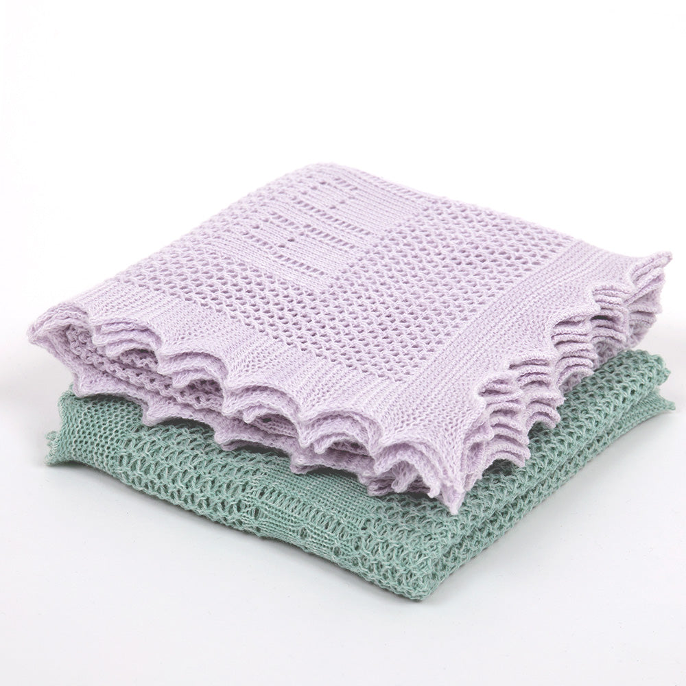 If you are looking for a special gift for a newborn, this cute little baby blanket is an ideal choice. We love the cotton and wool blend of this baby wrap, with its “Apple of My Eye” lace detail, knitted in two lovely fresh shades. A wonderful addition to any nursery. Size: 82 x 82cm approx. Colour: Lilac. Yarn: 50% Cotton / 50% Wool.