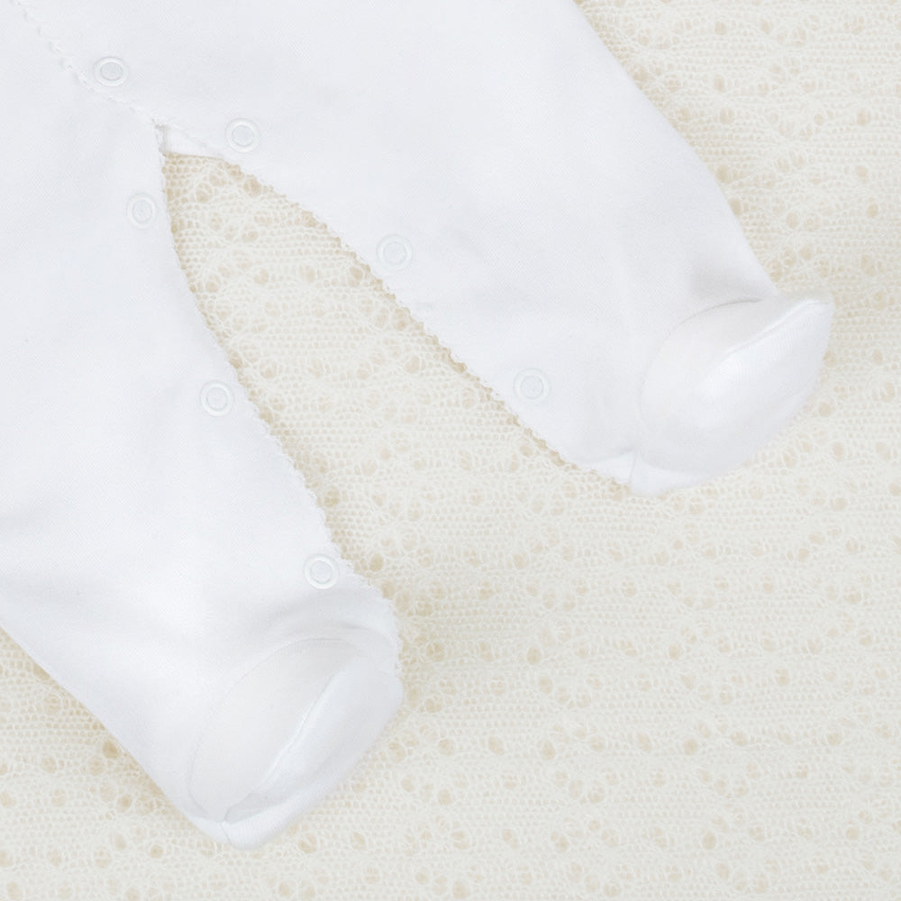 This exquisite babygrow boasts an elegantly classic design and a super-soft texture, maximising comfort for baby's delicate skin.