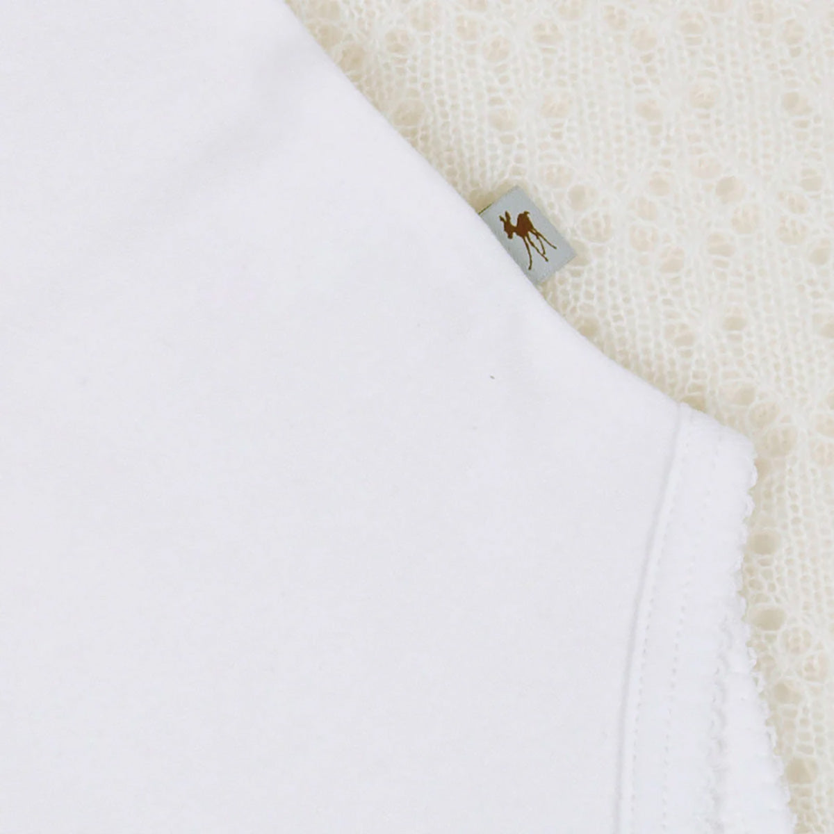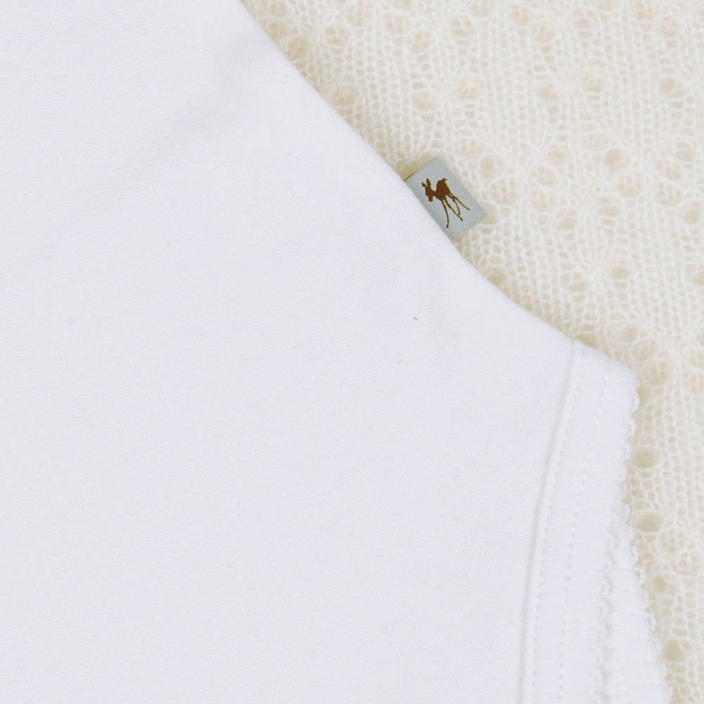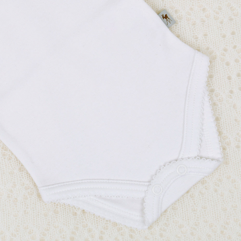 Adorned with our signature baby fawn logo in rich chocolate brown and an exquisite white picot stitched edge, this item has been designed to co-ordinate with and complement our timeless lace knitted baby shawls. The Baby Fawn Bodysuit is available in sizes 0-3M and 3-6M.