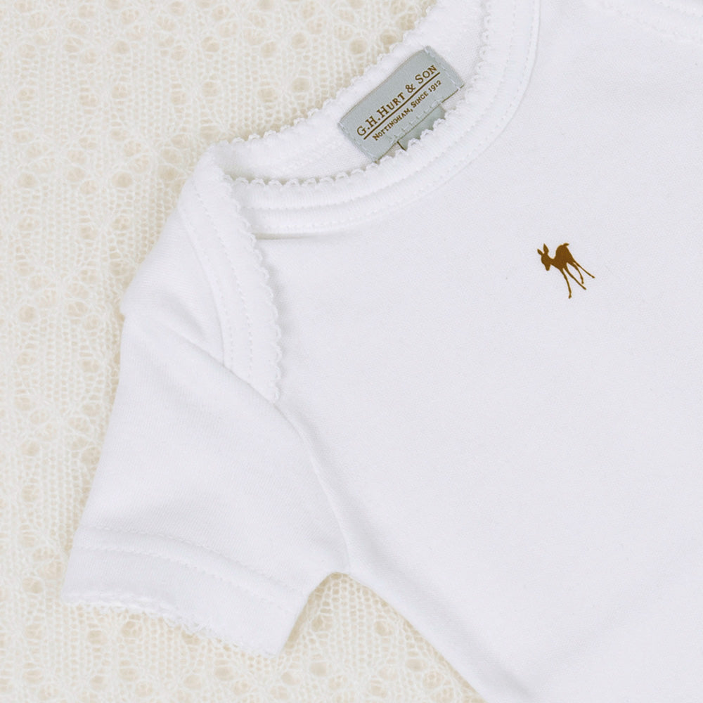 Our Baby Fawn Bodysuit is supremely soft and snuggly, elegantly styled and typically classic. The G.H.Hurt & Son luxury baby clothing collection is produced in the UK using a unique and environmentally responsible fabric containing 50% LENZING™ Micro Modal and 50% organic combed cotton. The Baby Fawn Bodysuit is conveniently designed with 2 nickel free poppers underneath, making it easy to slip on and off baby.