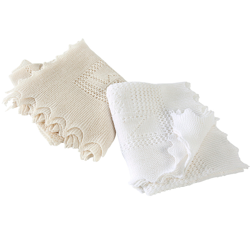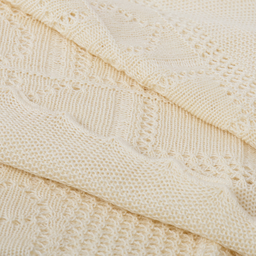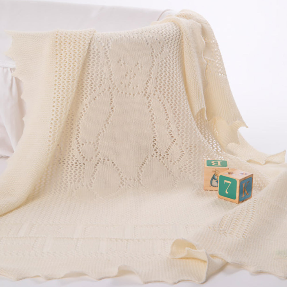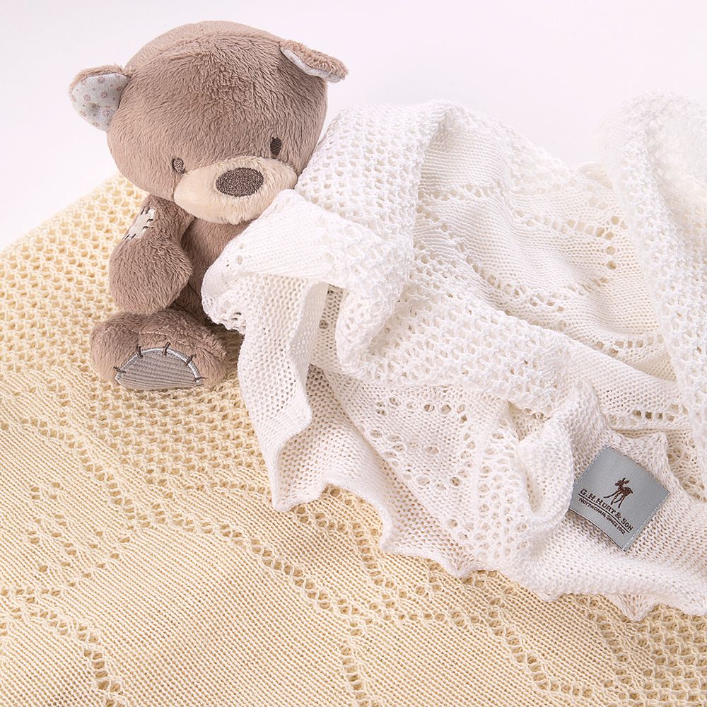 Cute cream baby shawl with teddy and alphabet design. Made with a mix of 50% fine merino wool and 50% soft cotton. A great size for using in a pram or pushchair, or as a blanket to tuck around your baby whilst travelling in the car. Size: 82 x 82cm approx.