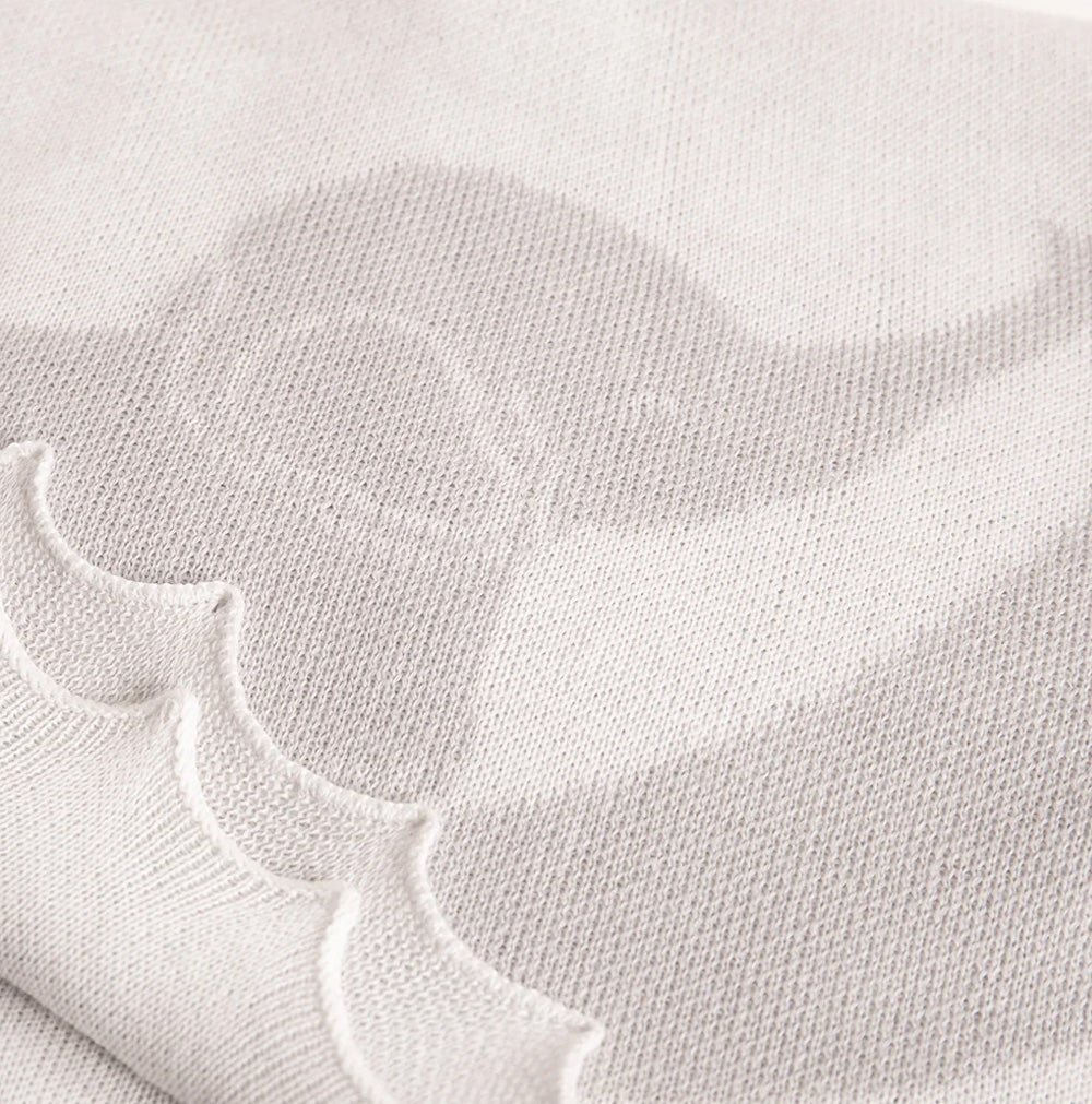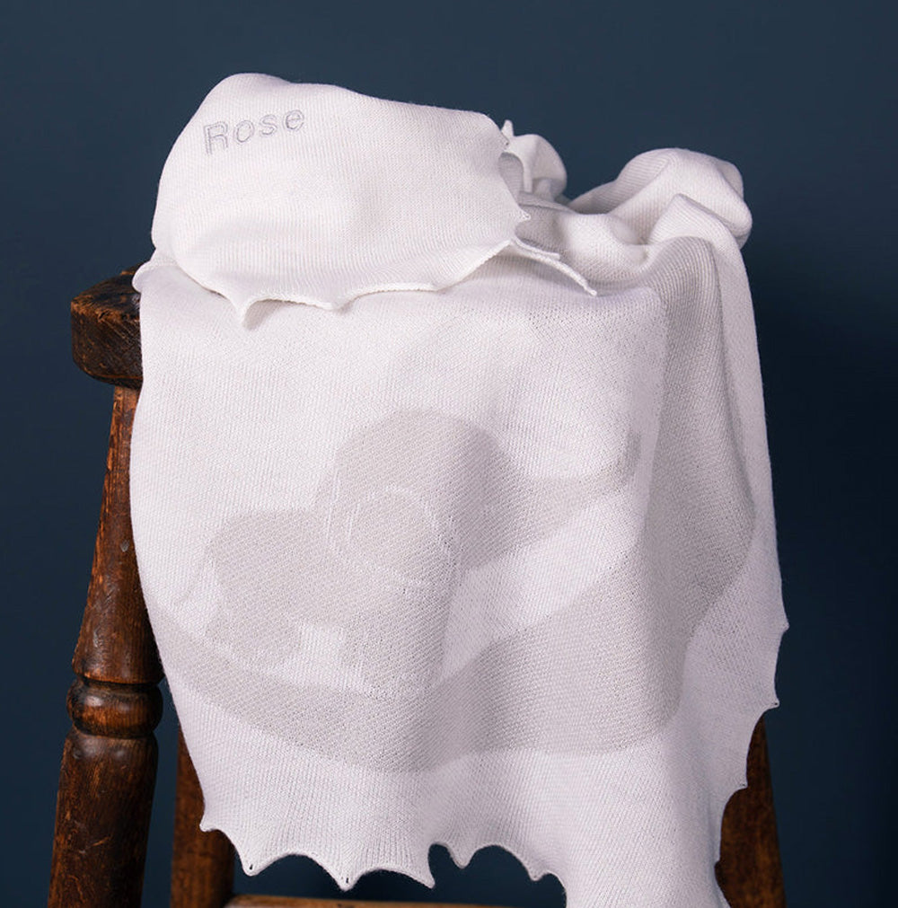 An adorably fine 100% merino wool shawl featuring a grey baby elephant on the moon. This super-soft blanket, with a delicate scalloped edge, can be personalised to add the name of your precious little one and is beautifully presented in a G.H.Hurt & Son linen finish embossed gift box, perfect for storing your shawl. Making this a special gift. Size: 80cm x 80cm.