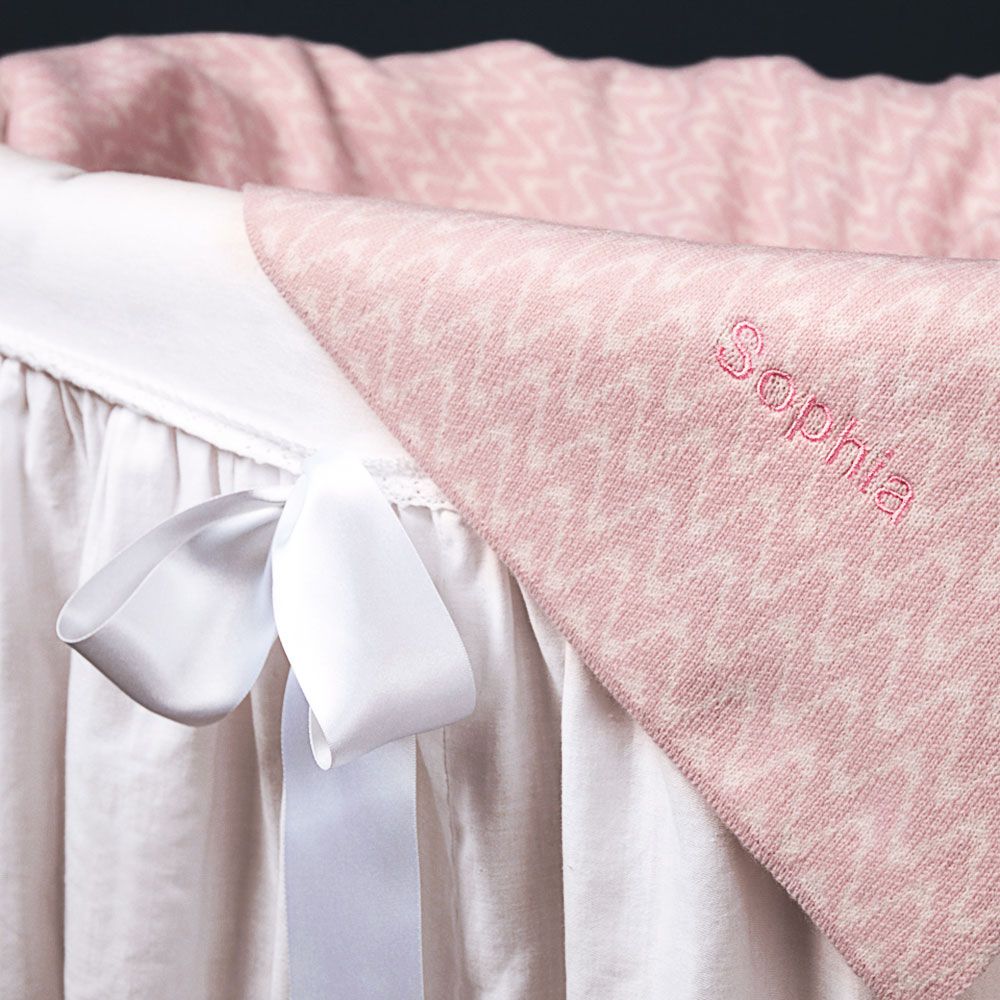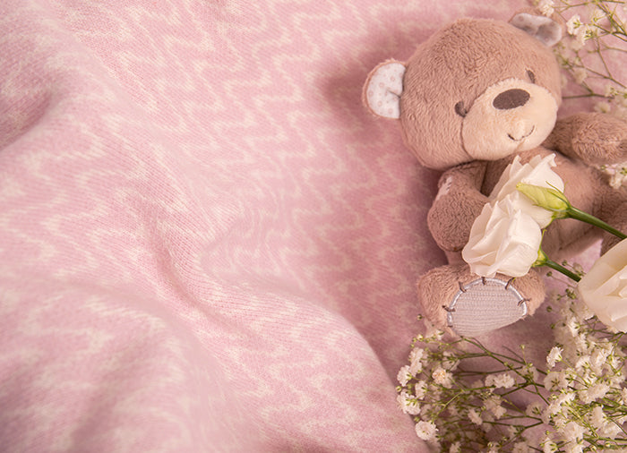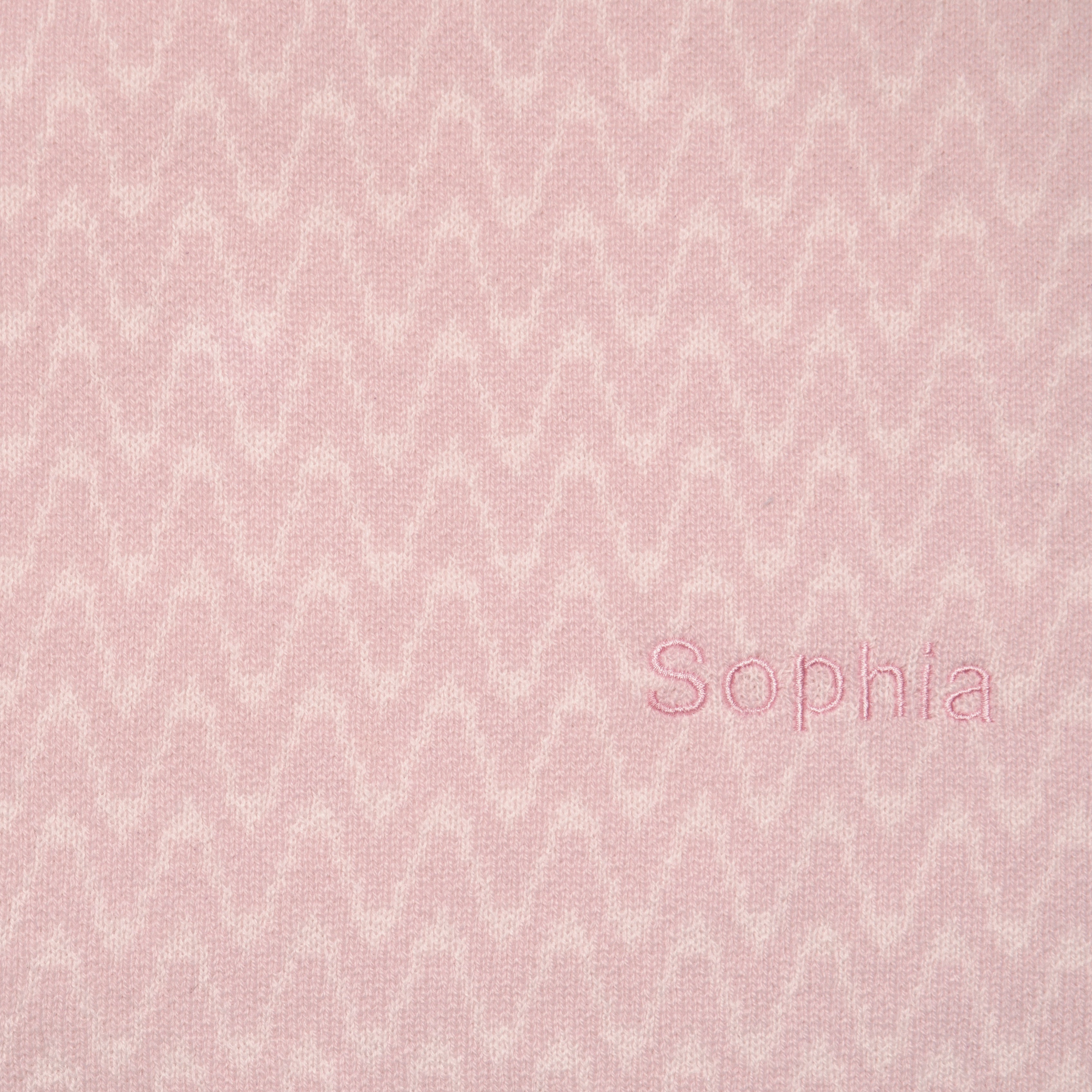 Sumptuously knitted 100% cashmere baby blanket in pink, presented in one of our white embossed gift boxes, making this a treasured gift to snuggle any new arrival. Deliciously soft to the touch, this shawl has the option to be uniquely personalised with your little one's name or initials. Beautifully crafted at our Shawl Factory in Nottingham, England. Perfect for baby's first years! Size: 96cm x 70cm.