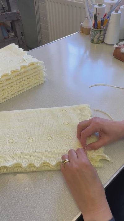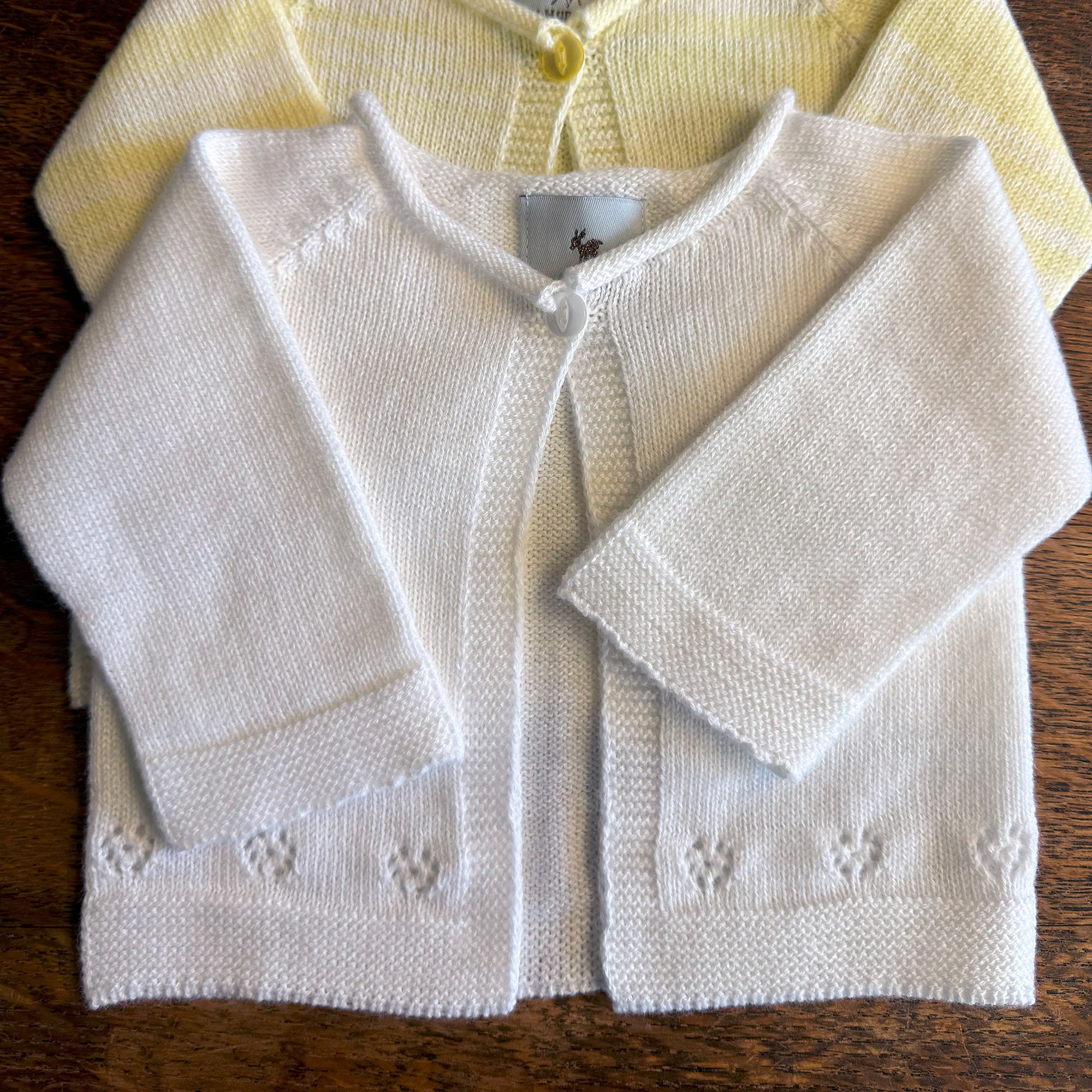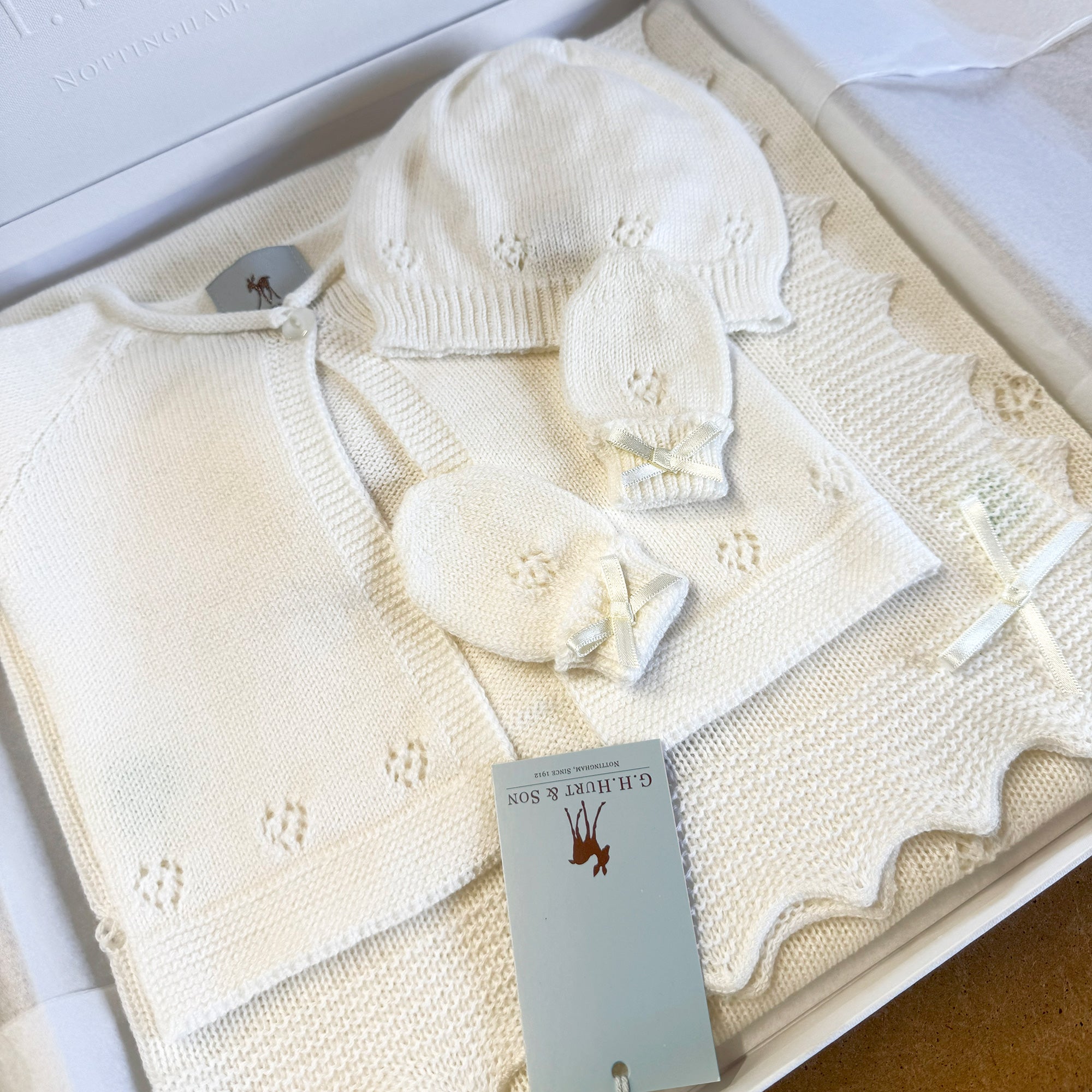 A timeless and classic Baby Layette Gift Set, comprising of a pointelle baby shawl, cardigan, and hat and mittens, all beautifully presented in a G.H.Hurt & Son hand crafted white embossed linen finish luxury gift box. Each knitted piece incorporates a pretty rose bud lace design, with the shawl and mittens hand finished with a cute little bow. Material: 50% Cotton / 50% Wool. Size: 0-3 Months. Colour: White.