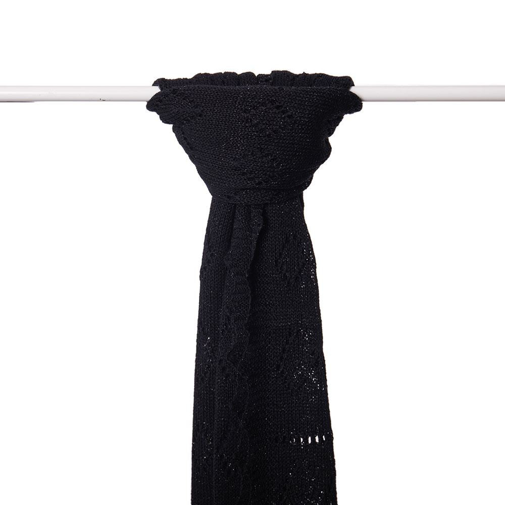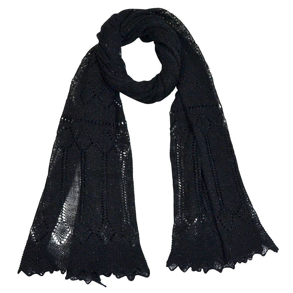 Made from 70% merino black wool and a 30% fine black glitter yarn. A perfect evening wrap for a special occasion or wear as a scarf anytime to add a touch of sparkle to your day. Size: 154 x 48cm.