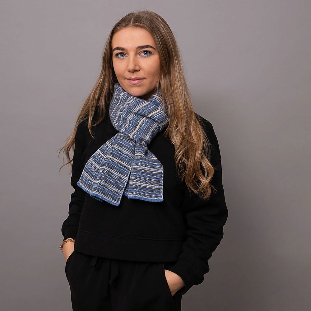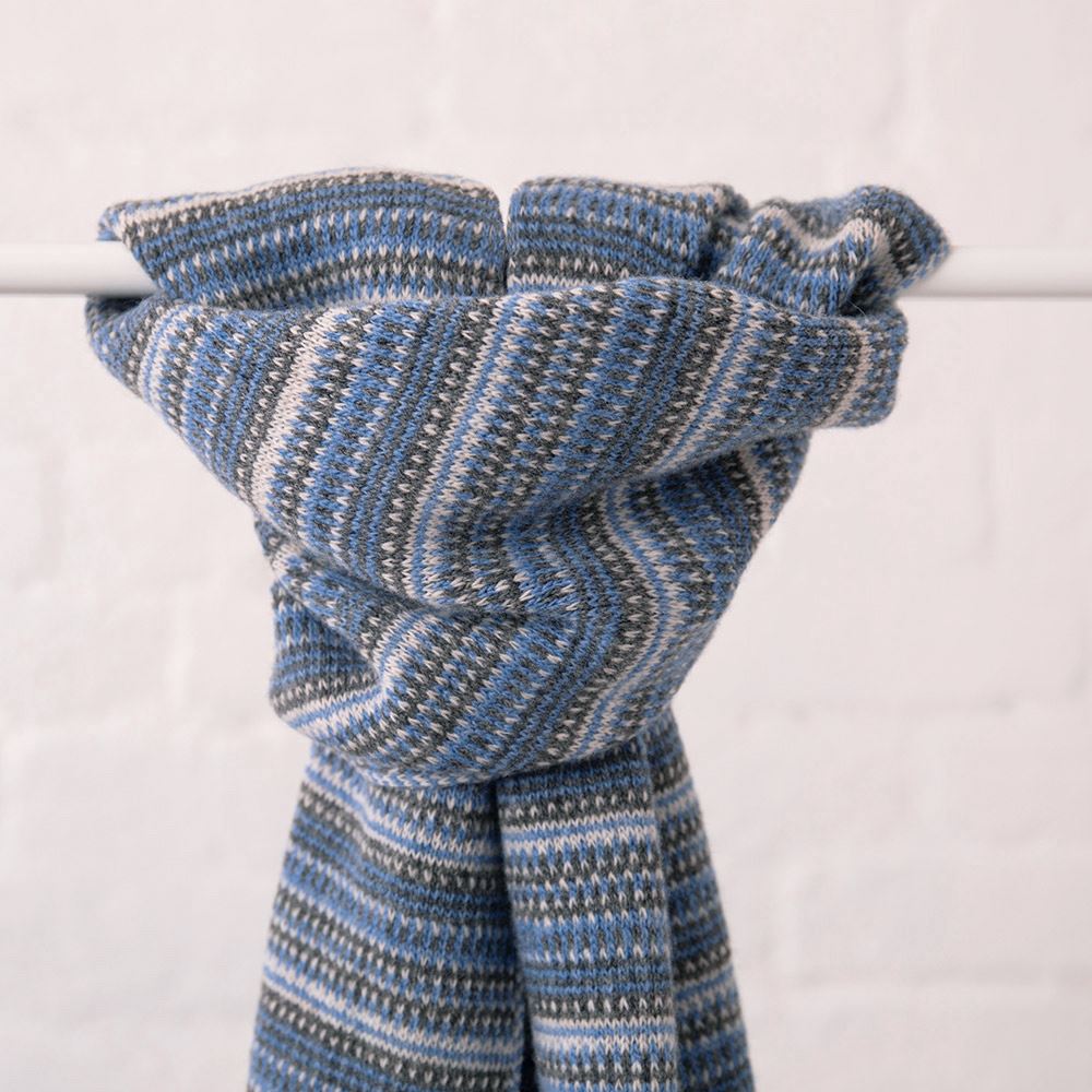 Keep warm this winter with our tweed jacquard scarf knitted in British spun 100% lambswool. Colour: Jeans Blue. Size: 170 x 24cm.